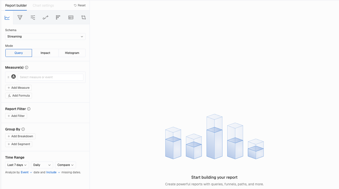 The report builder panel is now positioned on the left side of the screen, with the chart visualization taking up the remaining space on the right. The new Chart Settings tab is integrated directly into the builder panel, allowing you to refine and customize visualizations inline. This architectural change also sets the foundation for expanded visualization real estate coming in future releases.