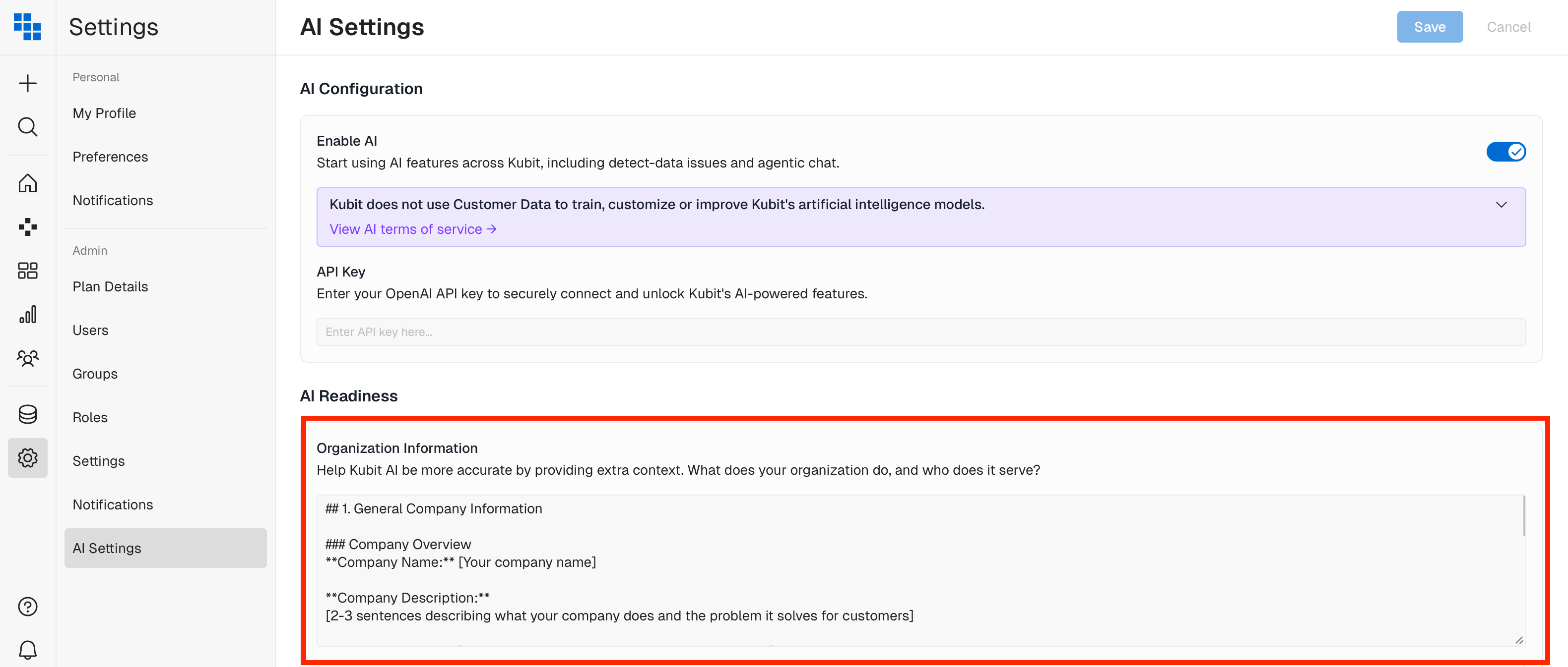 Teach Kubit's AI about your business. Enter company specific instructions that make every AI interaction more relevant to your organization.