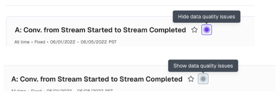 - Show/Hide Anomalies: A new toggle icon in the chart header lets you show or hide detected anomalies. When hidden, tooltip information about data issues is also hidden. The toggle appears only when anomalies are detected and works in Build, View, and Compact header variants.