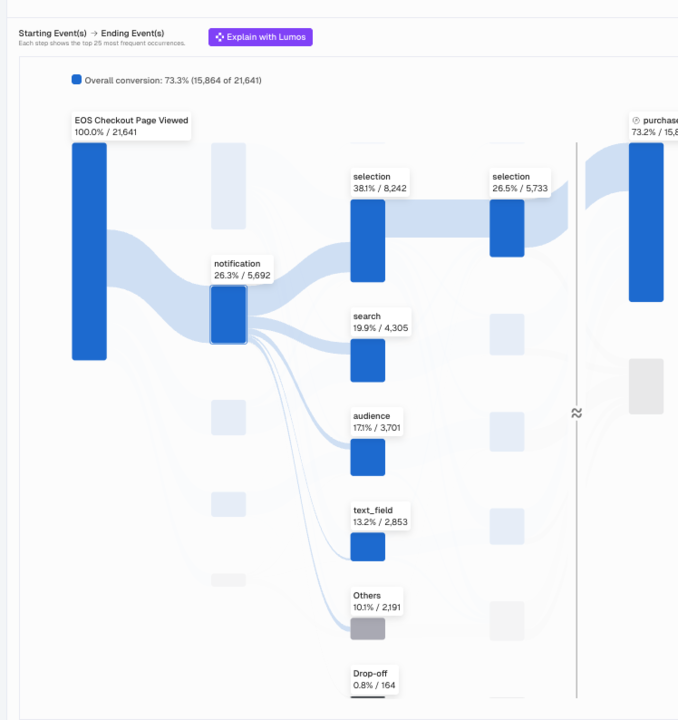 See all users who entered a flow, not just those who converted. Drop off counts at each step reveal the full picture of user journey completion and abandonment. A Sankey visualization makes patterns immediately clear.