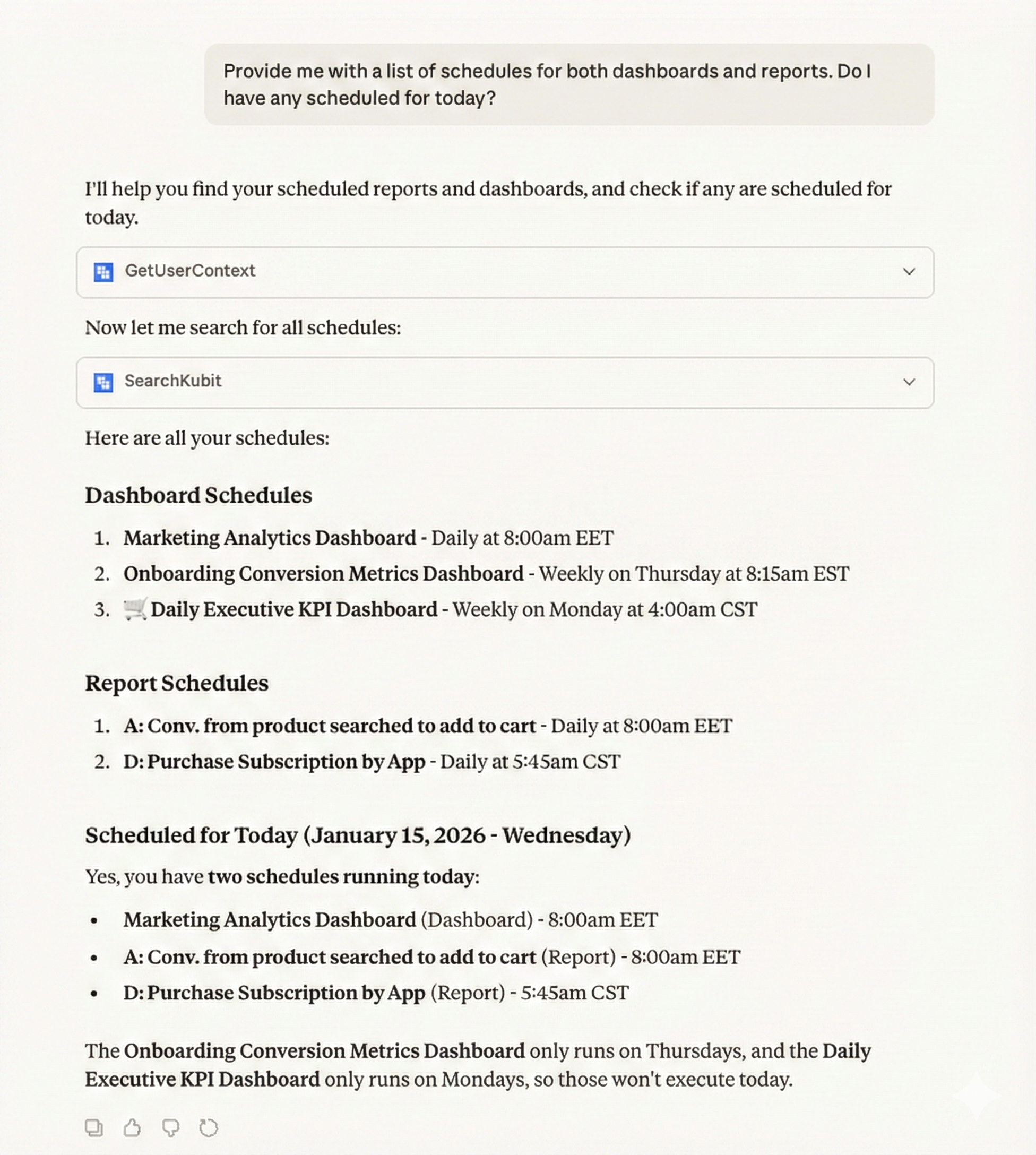 When you're working in Claude or Cursor, just ask about your scheduled analytics and get instant answers. Reference specific schedules in conversations, find that weekly report you set up last month, and manage your workflow without switching tabs. Your analytics stay with you wherever you're working.