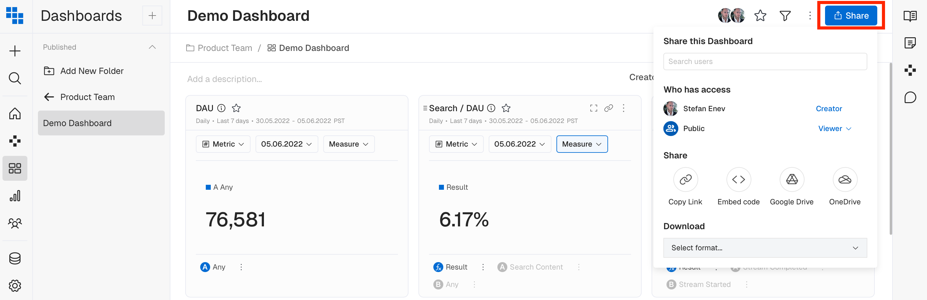 The share widget for dashboards has been redesigned for clarity and consistency.