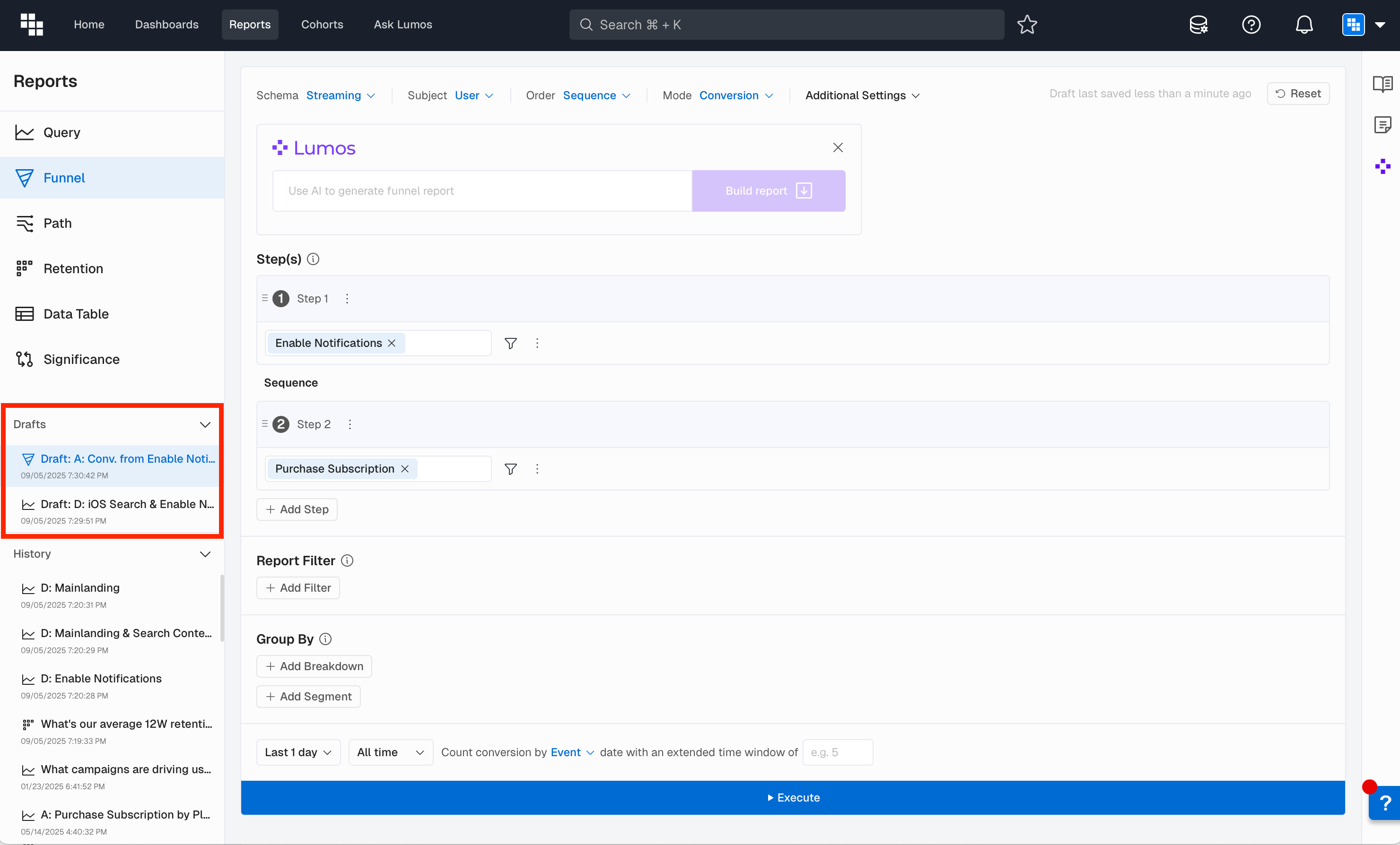 The Drafts feature provides a persistent, session-independent way to retain unfinished report work. Drafts are automatically saved when you begin creating or editing a Report without executing it.
