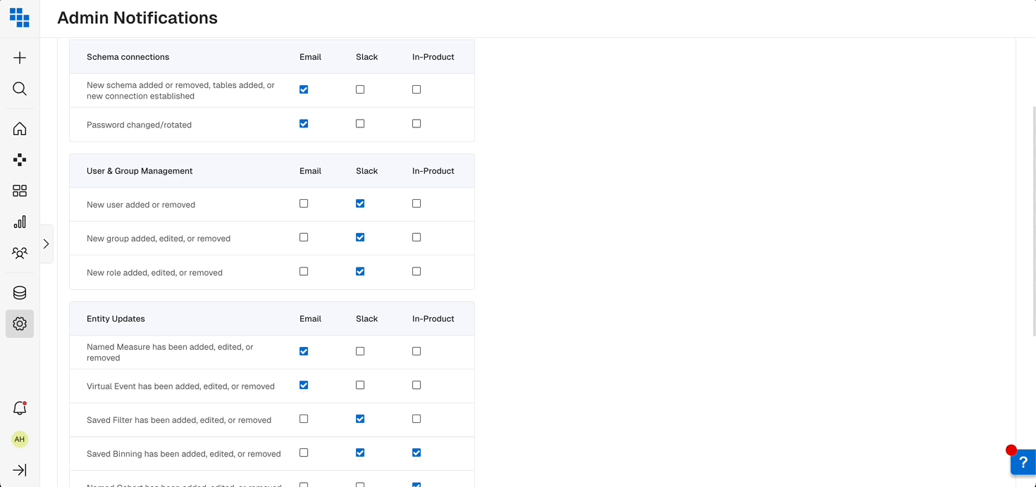 Determine which event to be notified for, and select whether to be notified via email, Slack (if configured) or in-Product. When ready, select Save at the bottom.