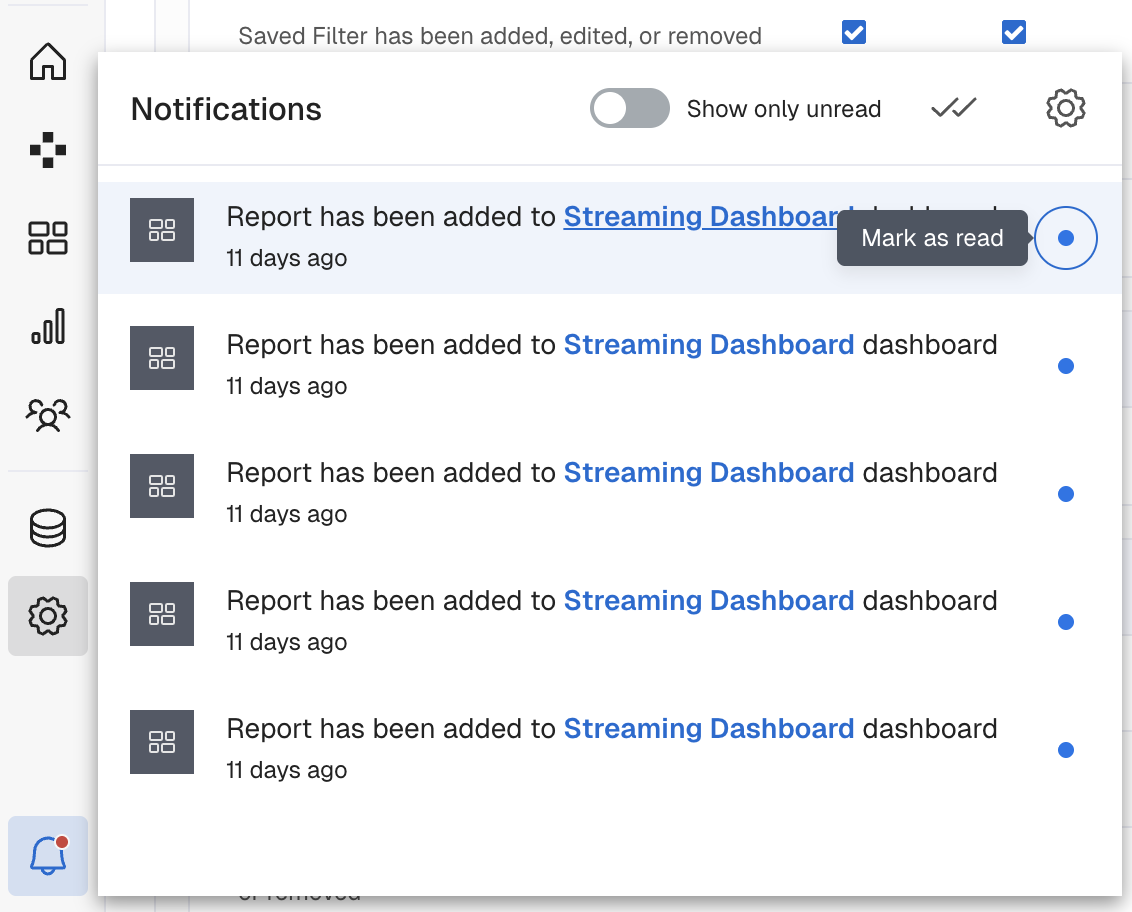 New Notifications will appear in-Product, denoted by a red dot on the bell. Click on the blue dot (beside the notification) to mark it as read. Clicking on the item will open the item in question.