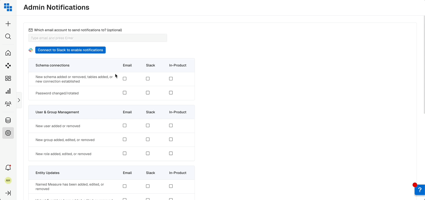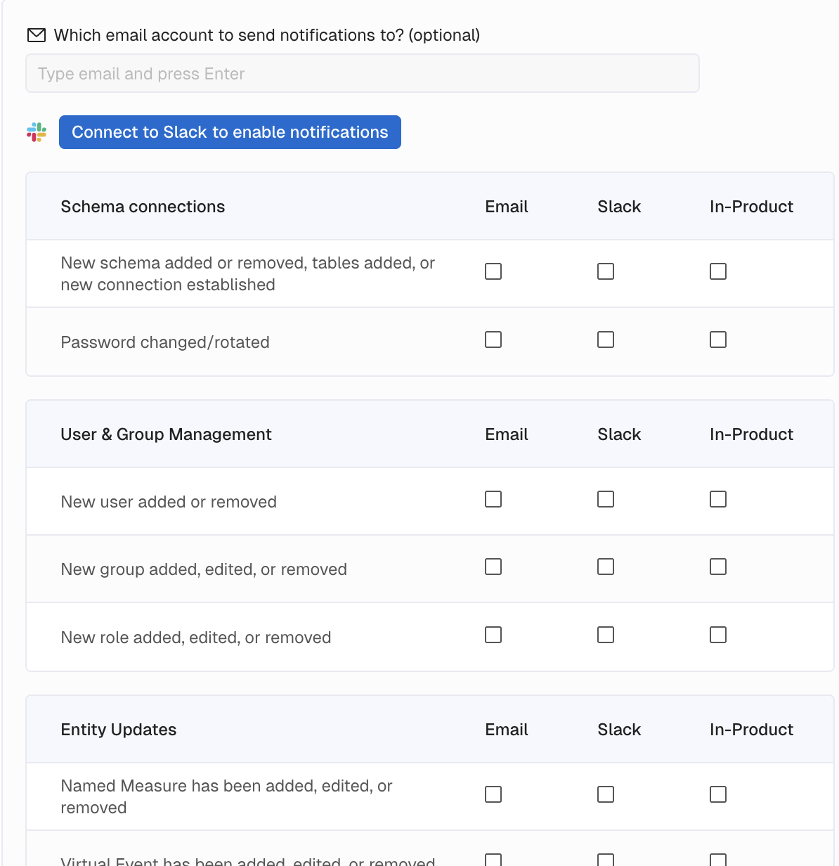 - The type of notification: Email, Slack or In-Product.