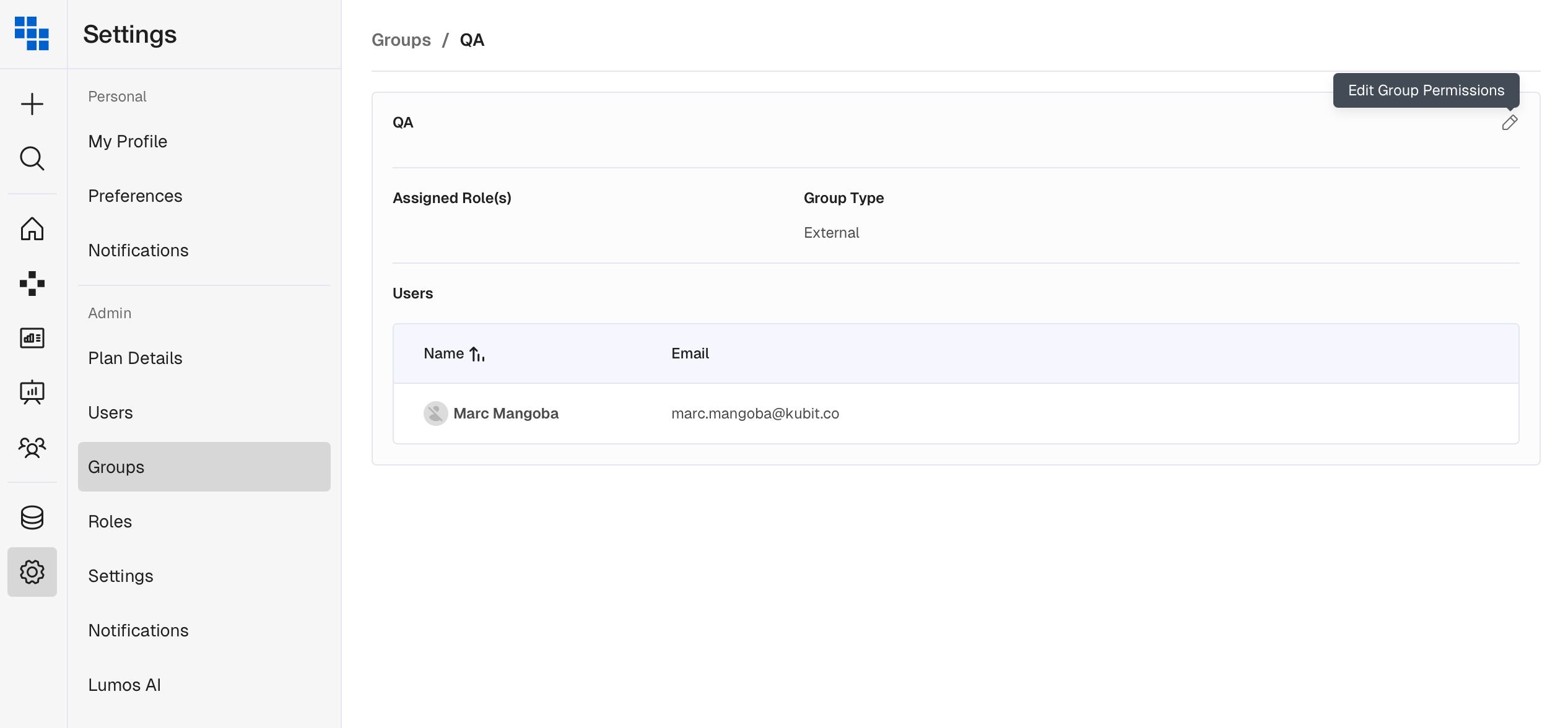 Edit Group Permissions( ✎ icon) - Modify the Group Name, Description or Assigned Roles. For