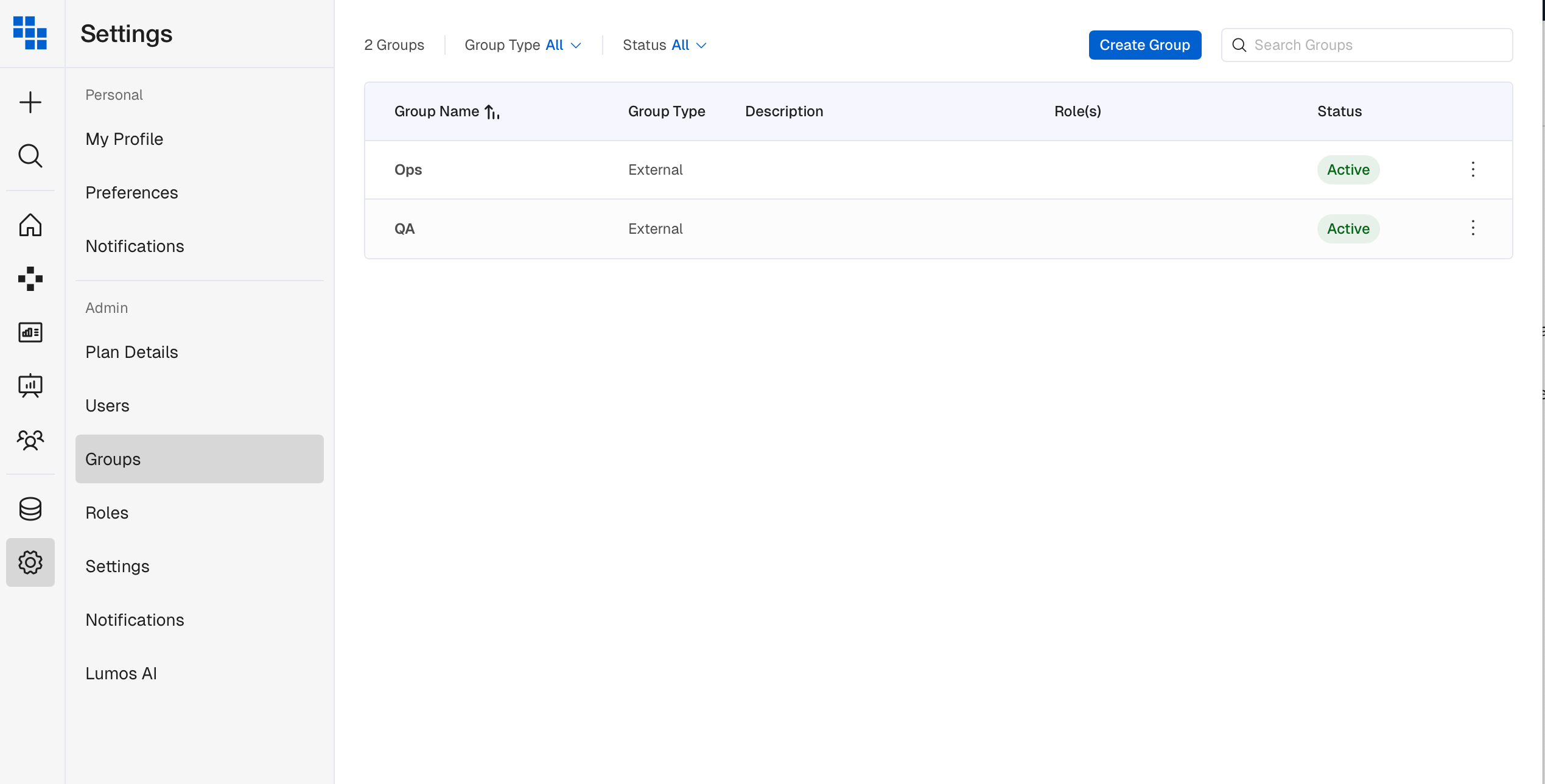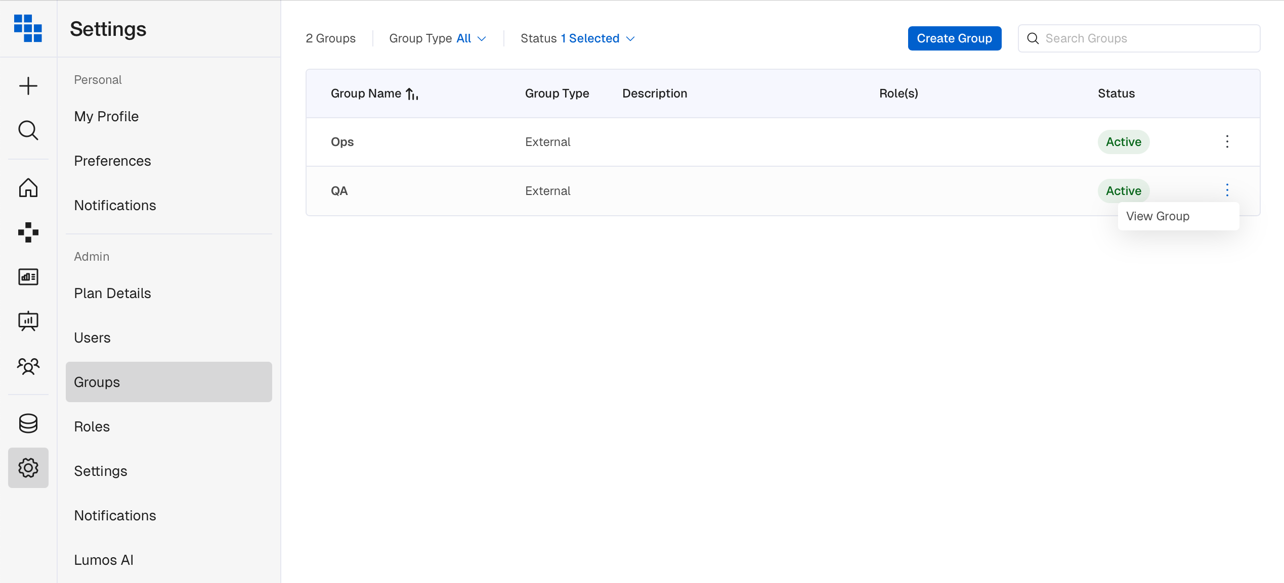 Create Groupat the top right corner and provision your new group as needed. - Add an Assigned Role to the group. These permissions will be set for all users assigned to that Group.