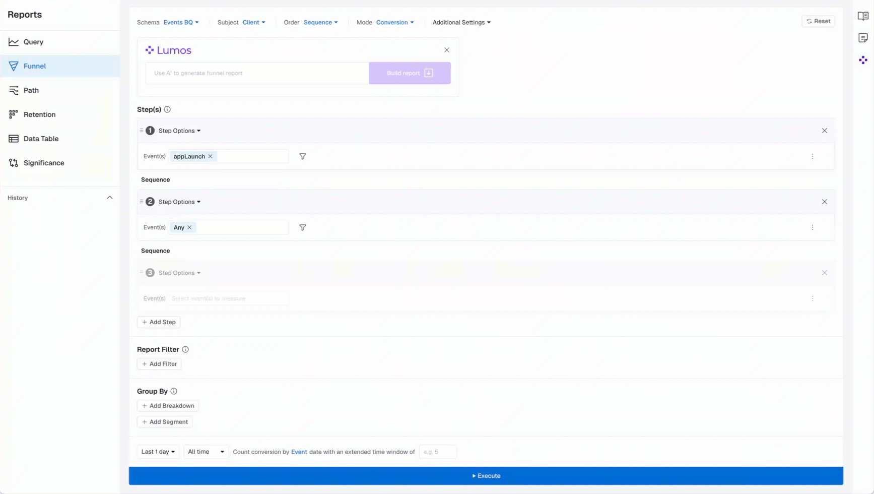 - These filters will be to the right of each event you've selected. This means only that event will be filtered by the conditions you set. Click on the funnel icon beside the event to begin creating your filter.