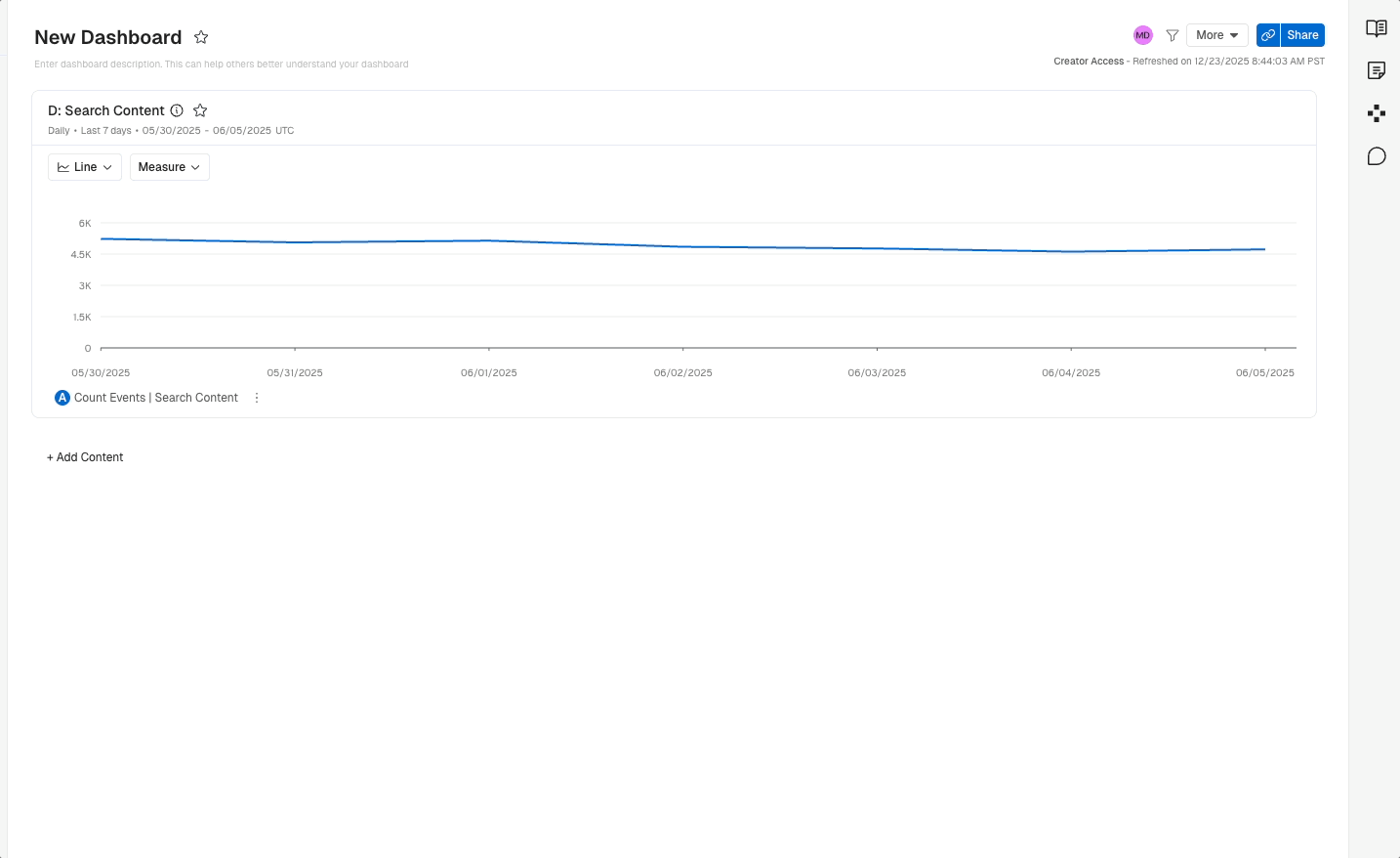 On a Dashboard, you can visualize results from multiple analyses simultaneously. The charts can be refreshed on a schedule to keep track of key metrics. You can create multiple dashboards that contain different charts. All the charts are interactive.