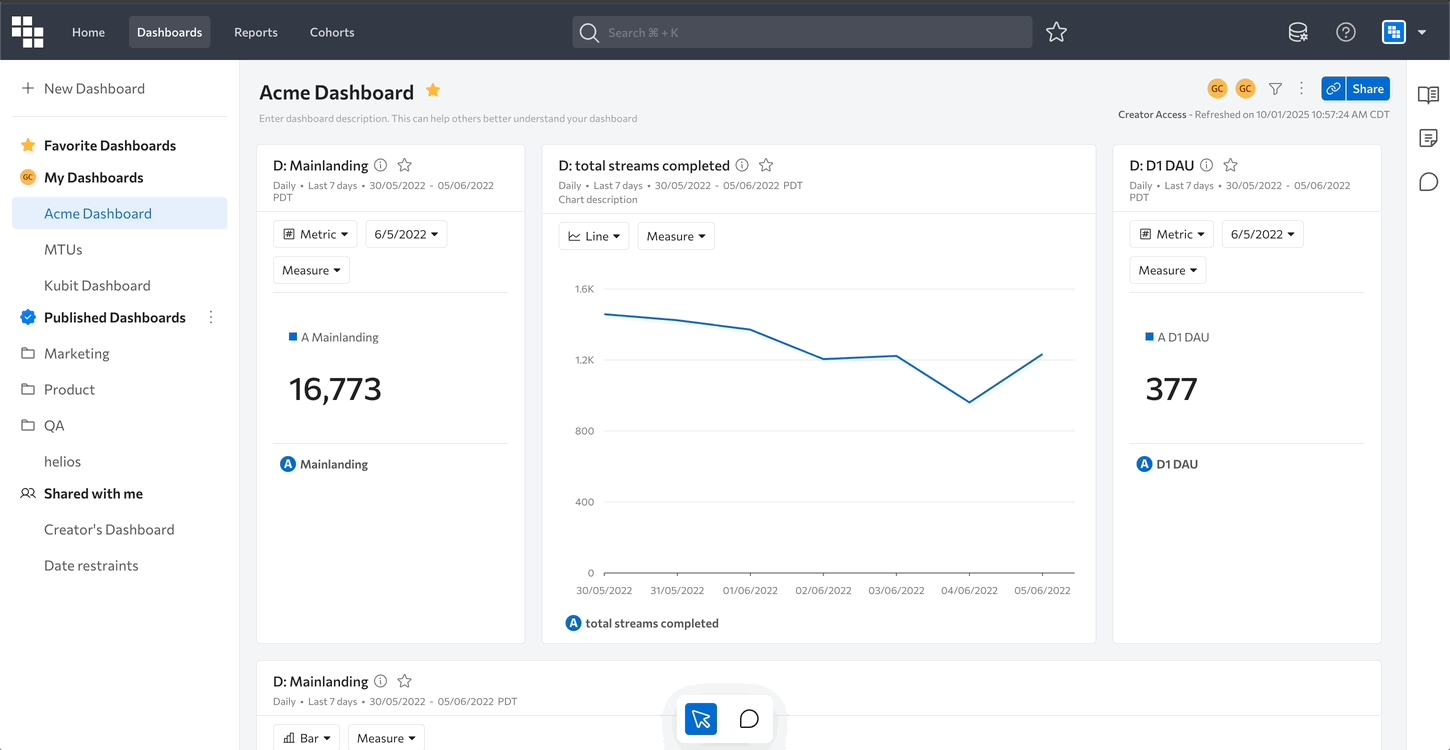 Speech Bubble Iconat the bottom of your Dashboard screen. - Click on a Report or blank space on the Dashboard. These leave comments on the Report widget or at the top of the Dashboard, respectively.