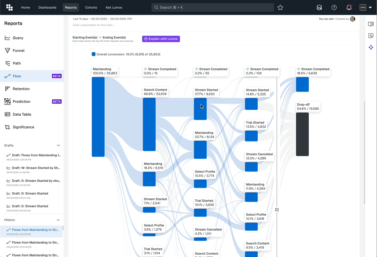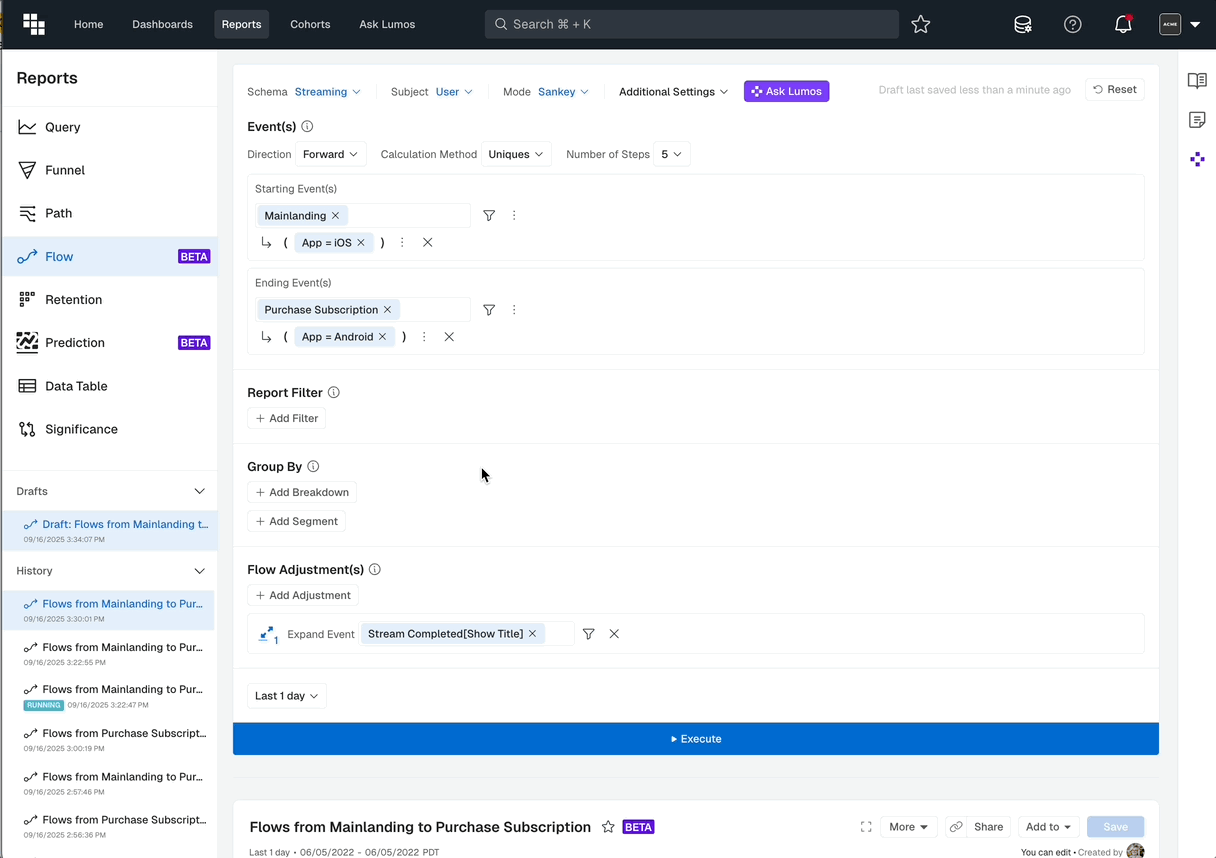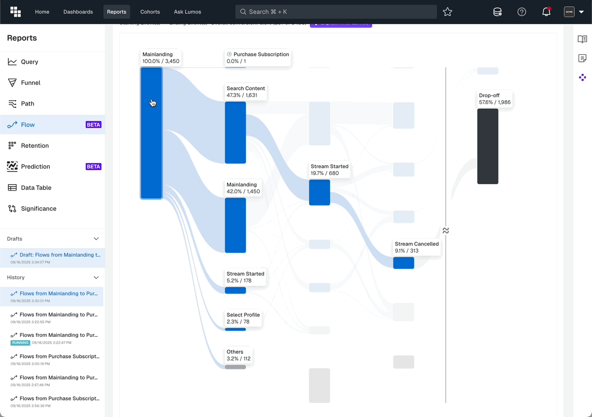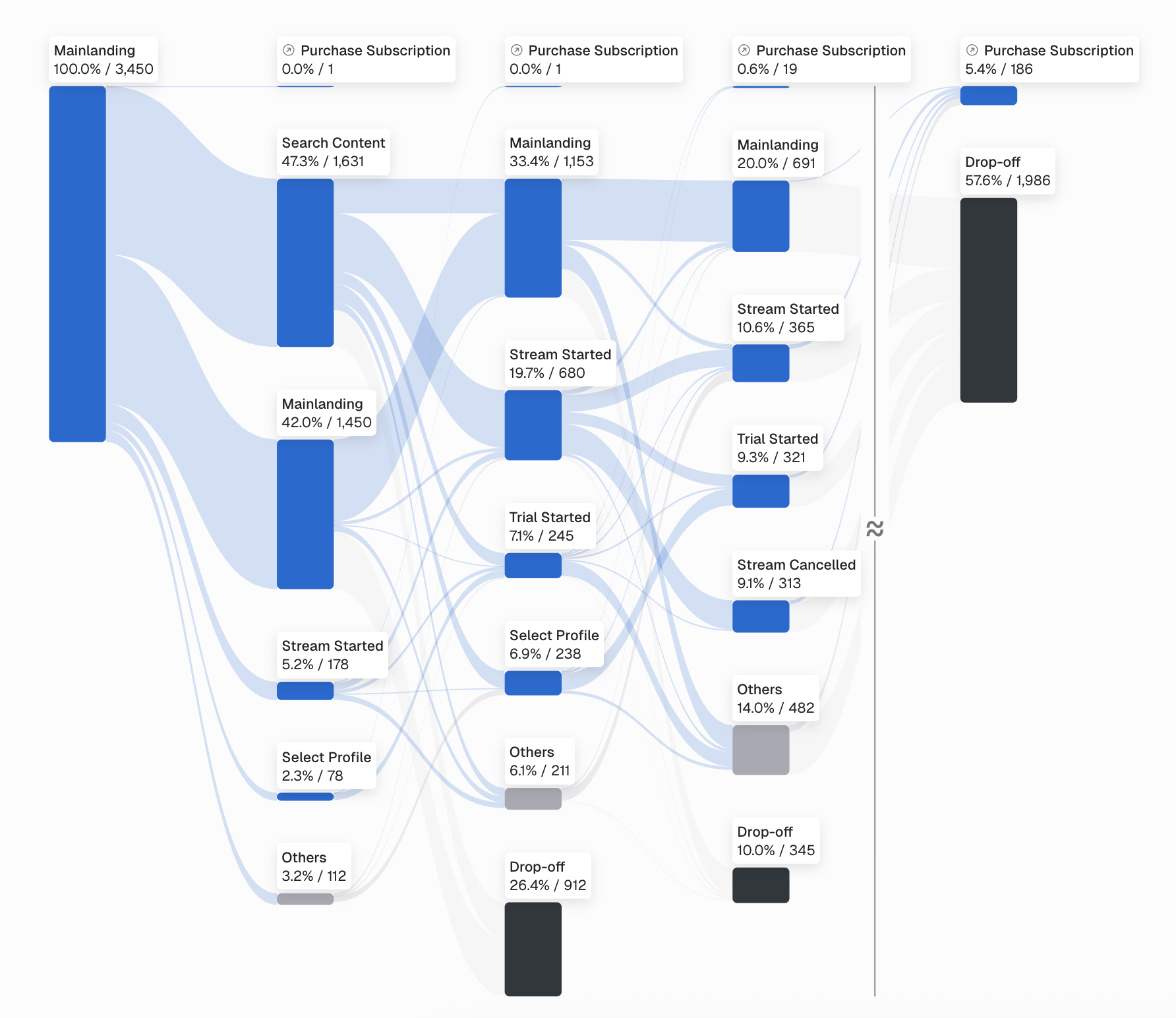When you're analyzing user flows it's important to visualize not just the conversion path to a final endpoint, but also the fallout or drop off within each step. To allow for this use case Kubit has released Flow in BETA.