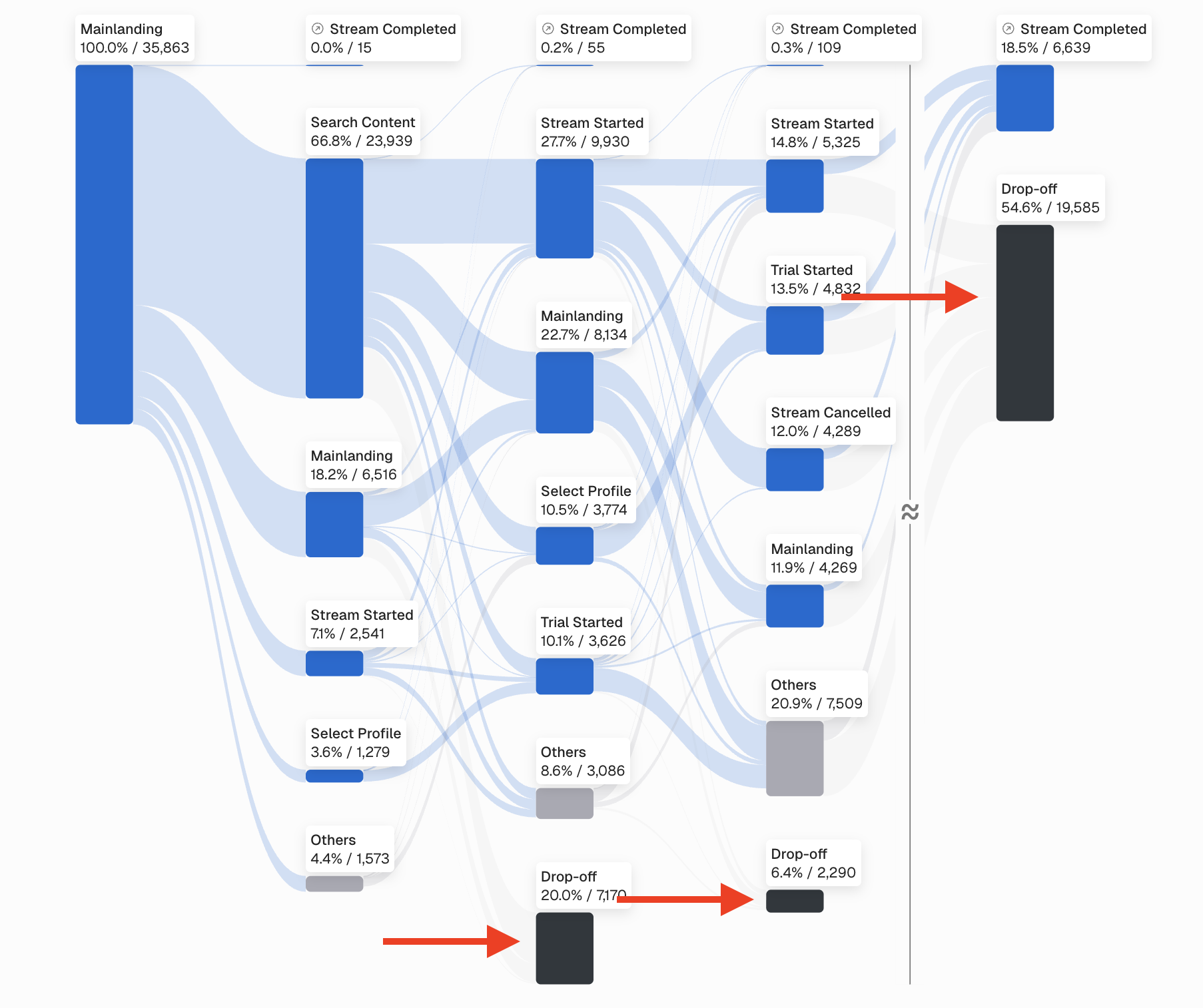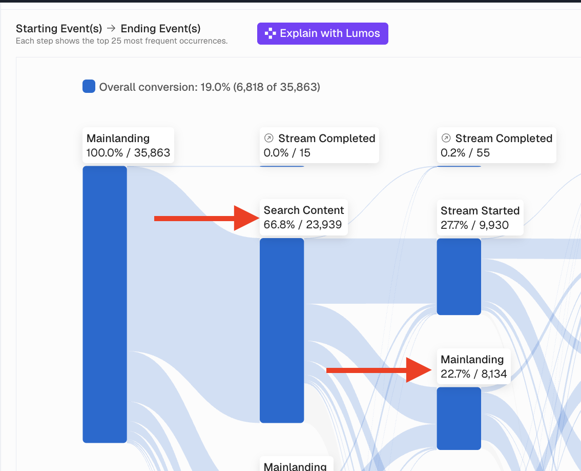Example: 66.8% of users go from Mainlanding to Search Content as their 2nd step. This equates to 23,939 unique users.