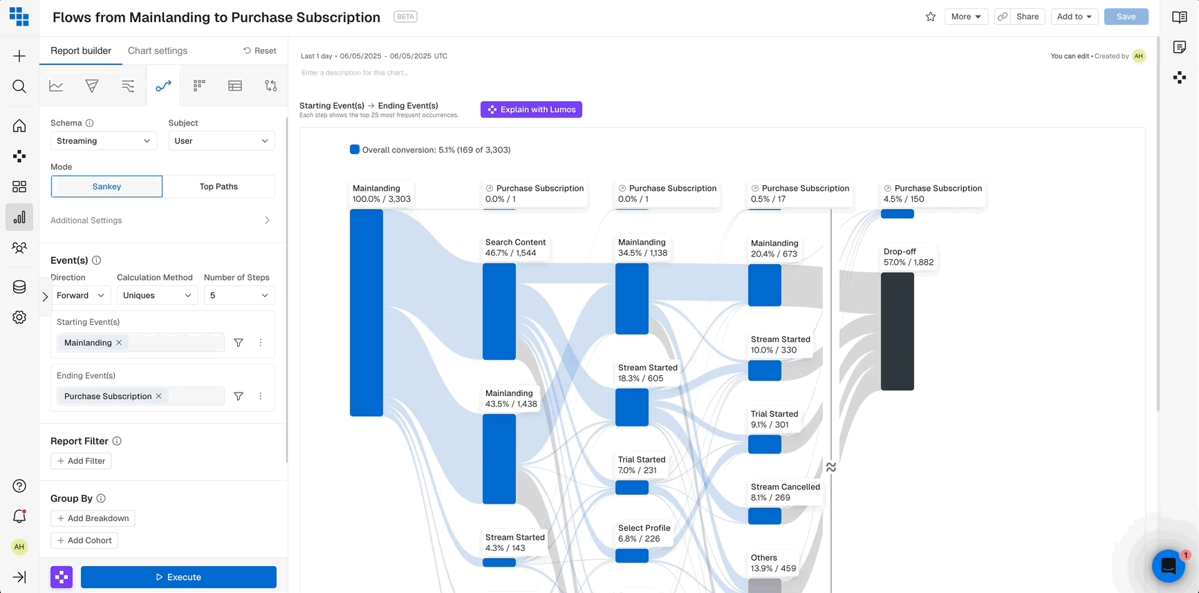 Flow reports analyze the most common paths toward a conversion, highlighting where users drop off at each step before reaching the final conversion event(s).