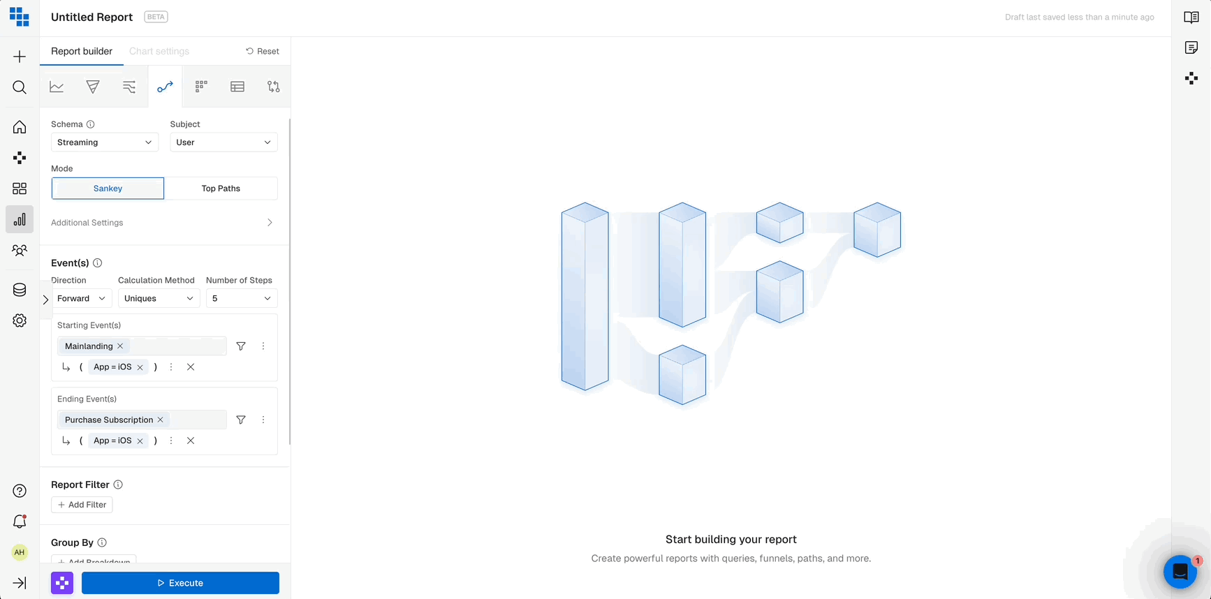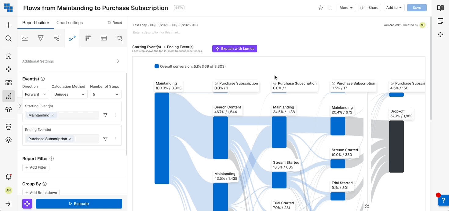 While Path focuses on users who complete the journey, Flow examines all users who start the journey, showing where they drop off. It provides complete drop-off counts for users who don't reach the final step.