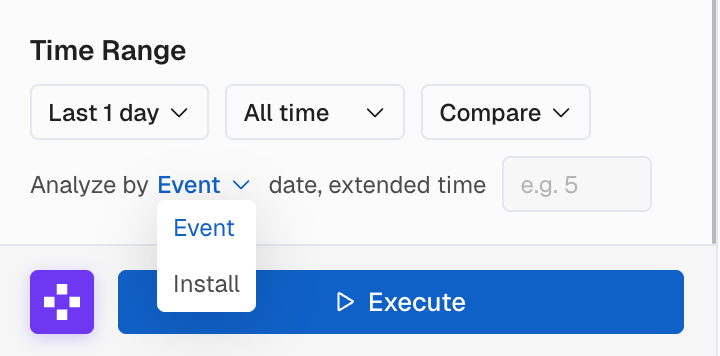 - Example: Set to Install and 0 days means they installed and performed Step 1 on the same day. Install with 30 means they installed and did Step 1 on days 0-30, etc.