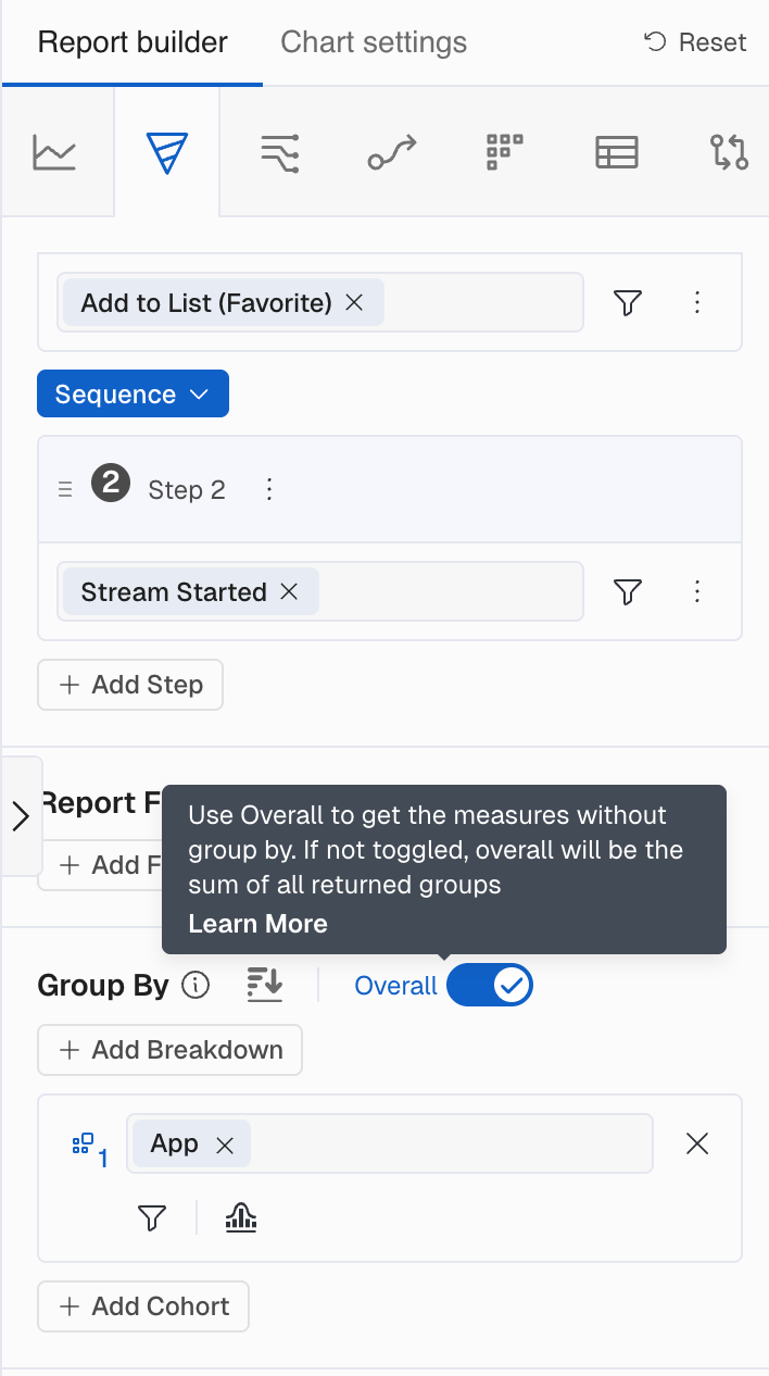 - Compare each group and Overall, providing total conversion rates for all users. This is useful for establishing a baseline. Enable this by turning the Overall switch to "on" (it will show blue), revealing an Overall group alongside the Breakdown groups.