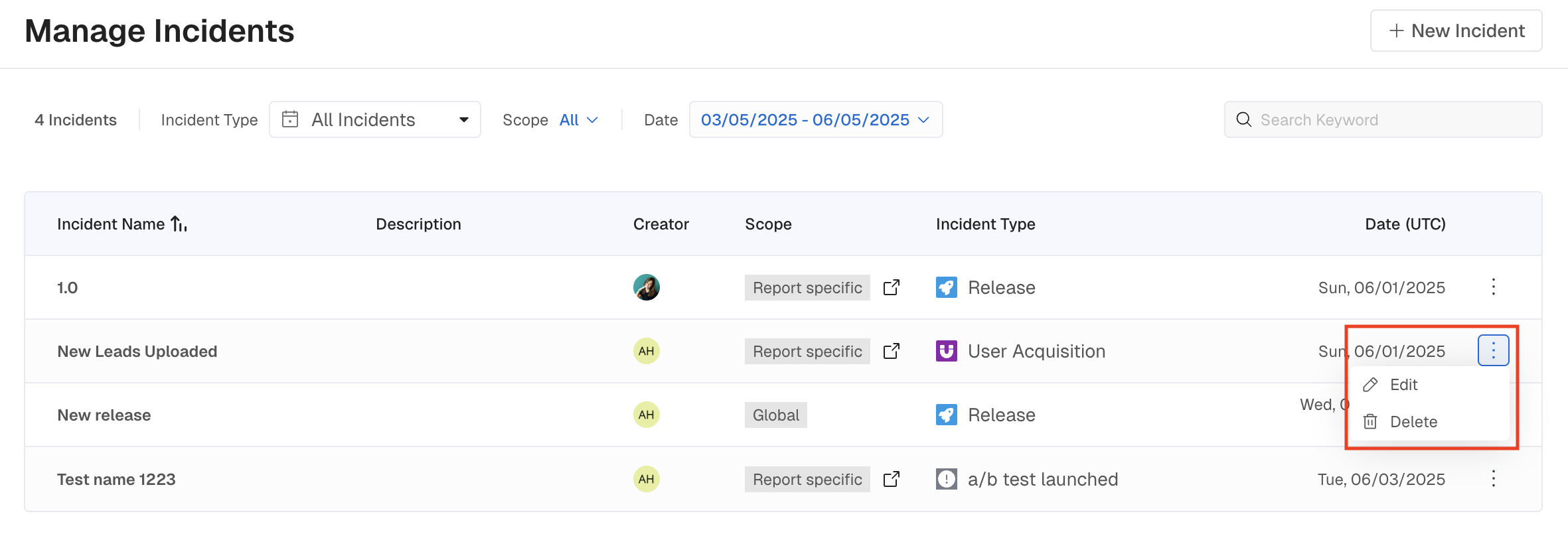 Clicking on the three vertical dots to the right of an Incident will let you Edit or Delete it.