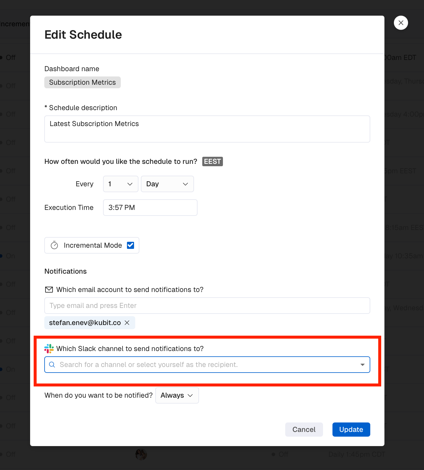 - Connect Kubit to specific Slack channels and receive notifications whenever your Scheduled Refresh completes