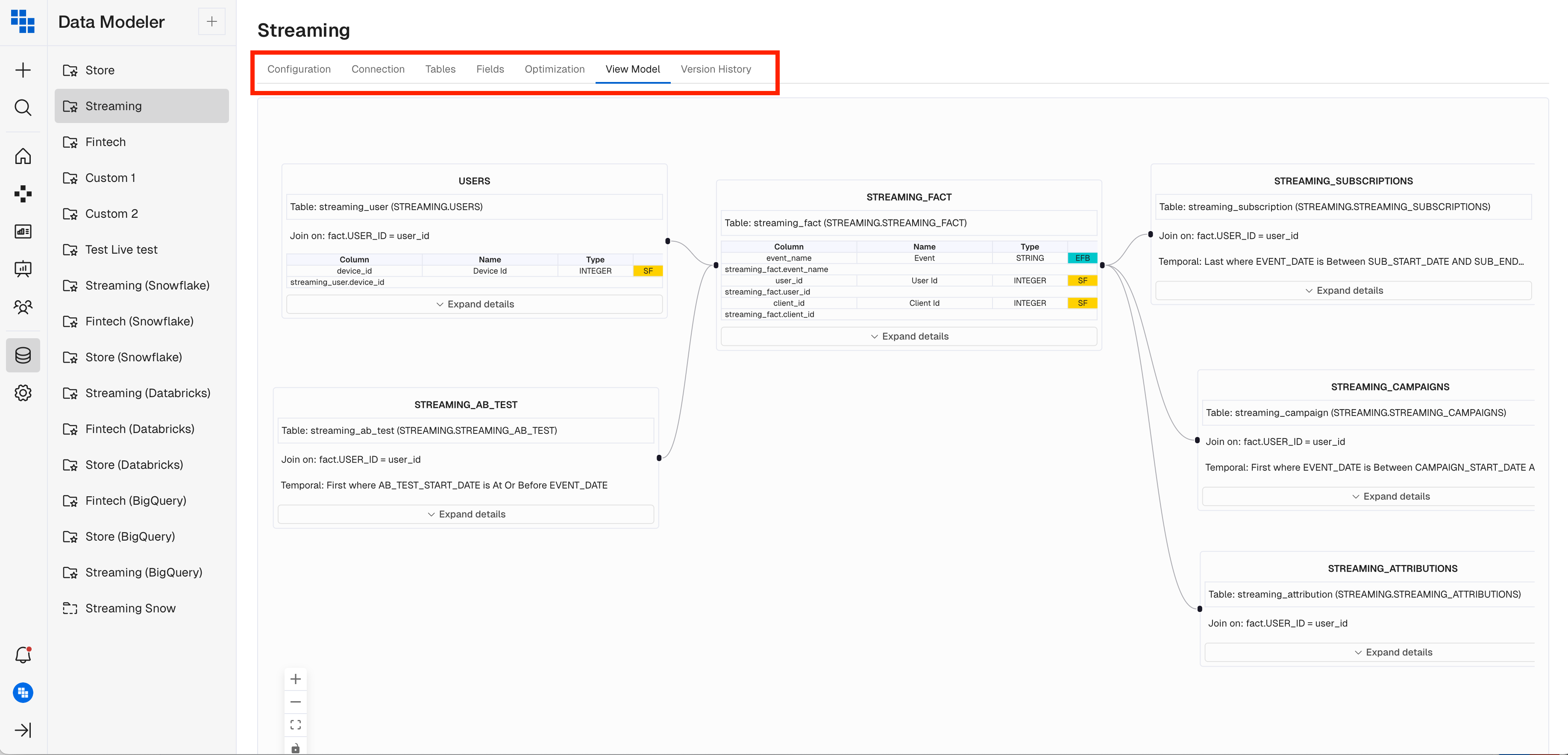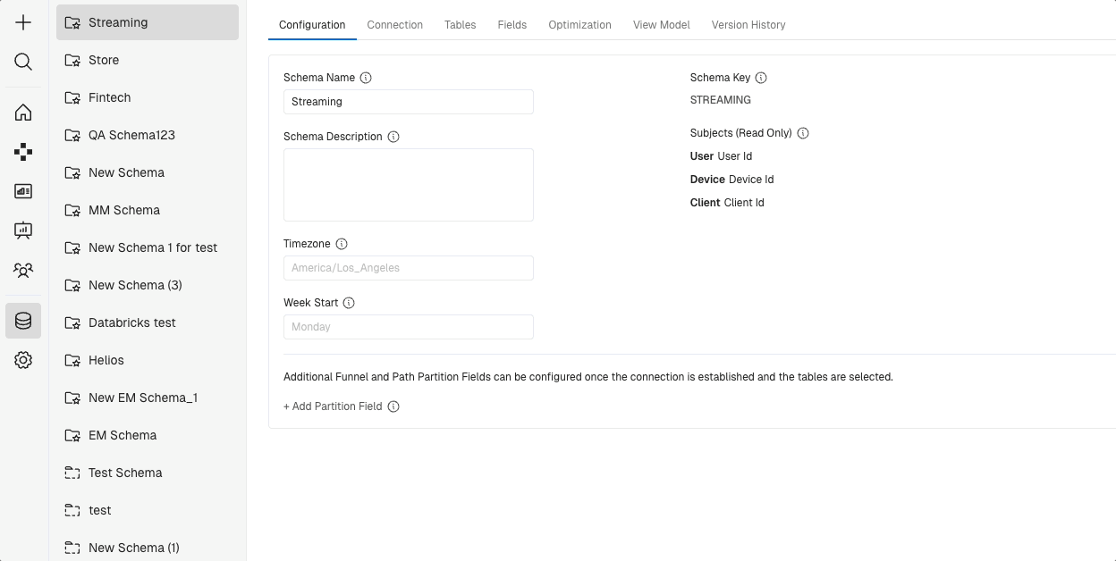 Configuration- The primary configuration for this Schema and area where you can update Schema names and add Schema descriptions.Connection- The connection parameters for the schema to your cloud data warehouse.Tables- The list of all tables/views being used in your Kubit schema. This is also the area where you can add more tables, expose more fields, and add derived columns.Fields- The "semantic" layer for Kubit and area you can rename Fields, add Field descriptions, create derived fields, and control if a field is available for breakdown and filtering. You can also disable Fields here so they no longer appear in Kubit.Optimization- An area where you can set query timeout parameters, look back windows, and Sampling rates for on-demand sampling in Kubit.View Model- View your entire data model.Version History- Review past versions of the Schema and restore old versions if necessary.