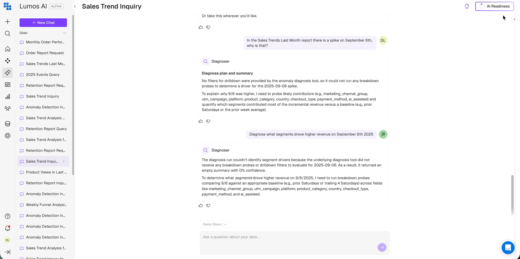 A chronological view of your workflow — what is being asked, what agents ran, what was found. It also include timestamp to help you navigate when interaction with Lumos Agents was conducted, in case you come back to the Chat conversation few days later.