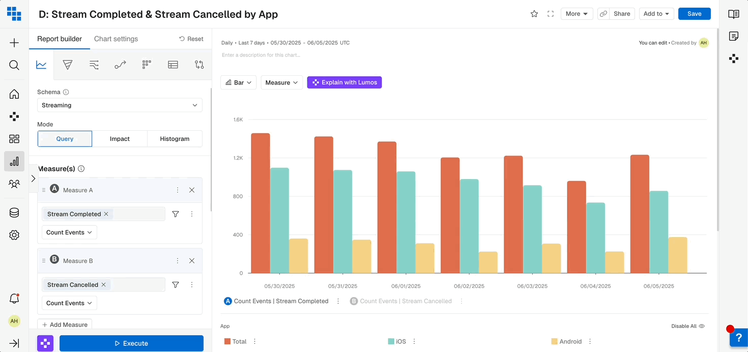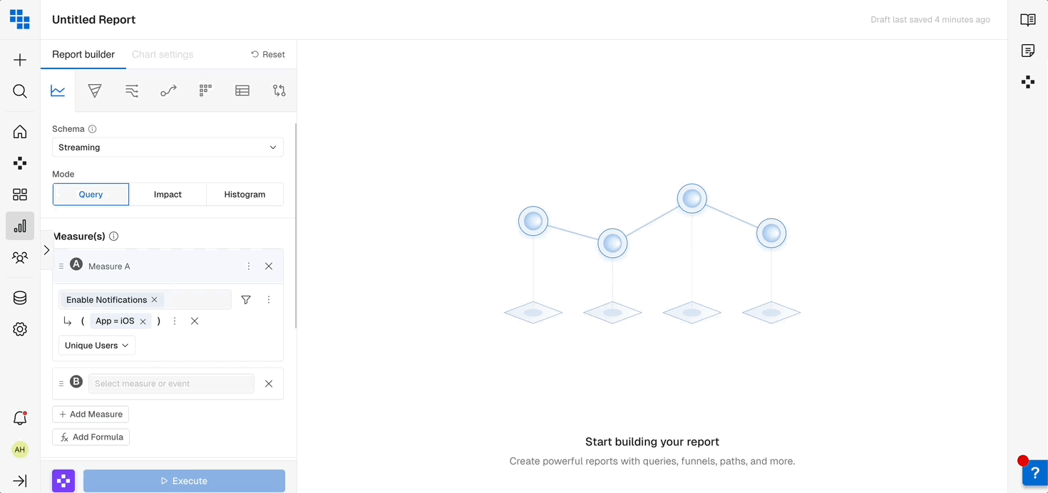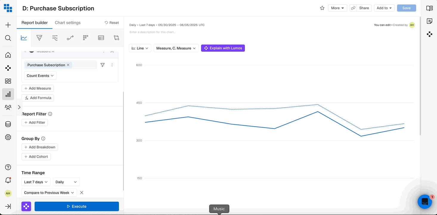 A measure consists of three components: the event to analyze, the function to compute, and any filters to apply. You can learn more about Measures in this article about components of a Chart.