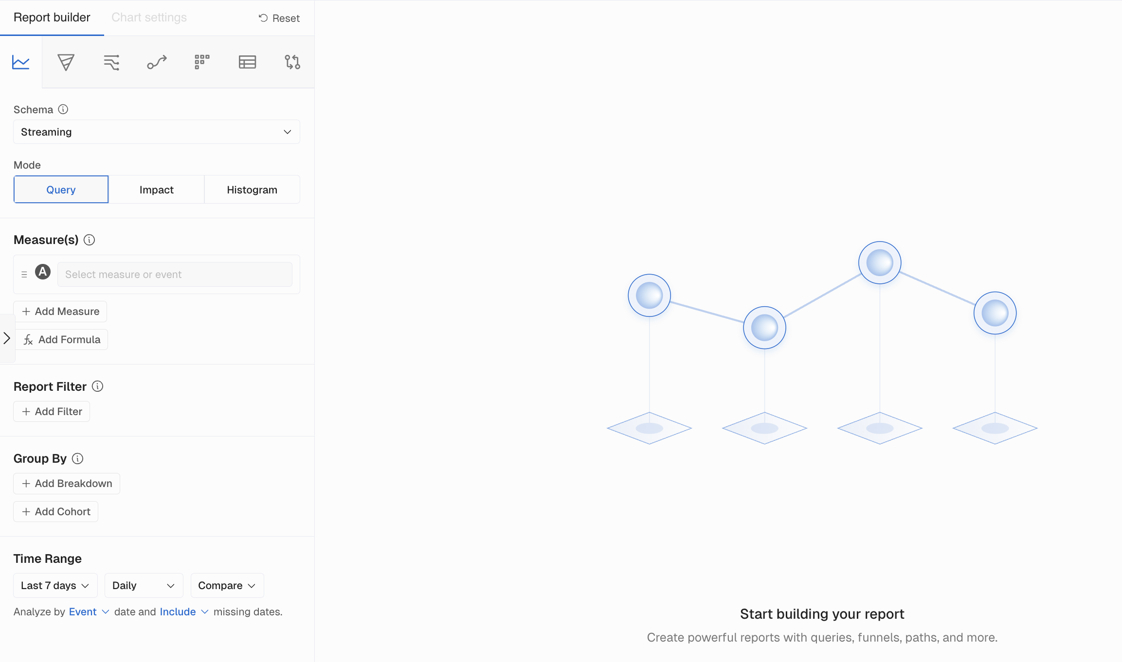 The default mode for Query reports focuses on "how many" type questions. Additionally, you can explore Impact Analysis and the Histogram modes. You can try these advanced features to help you identify more use cases to analyze your data.