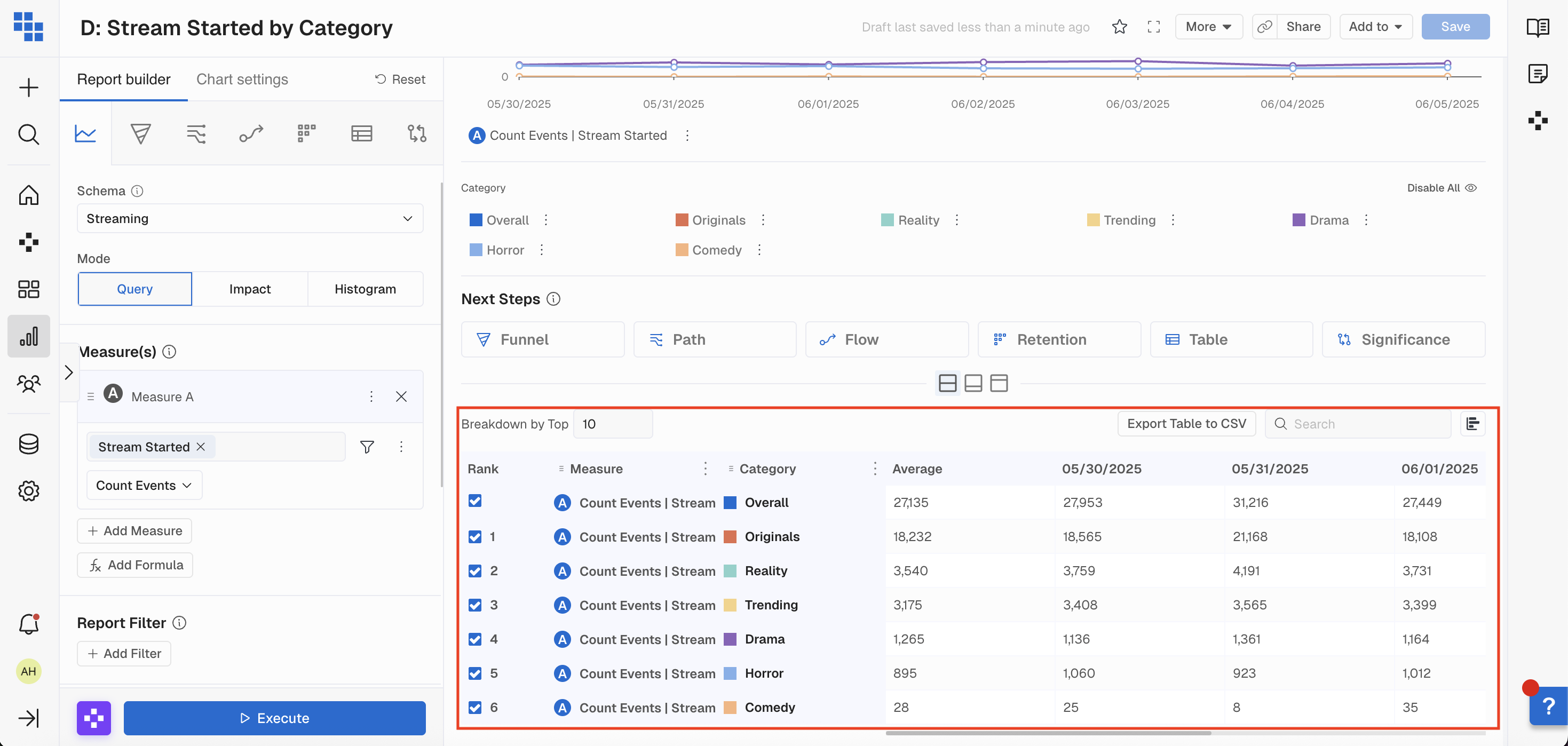 At the top of the Data Table section, there are options to display the top X rows, Export to CSV, Filter on a value, or show Horizontal bars.