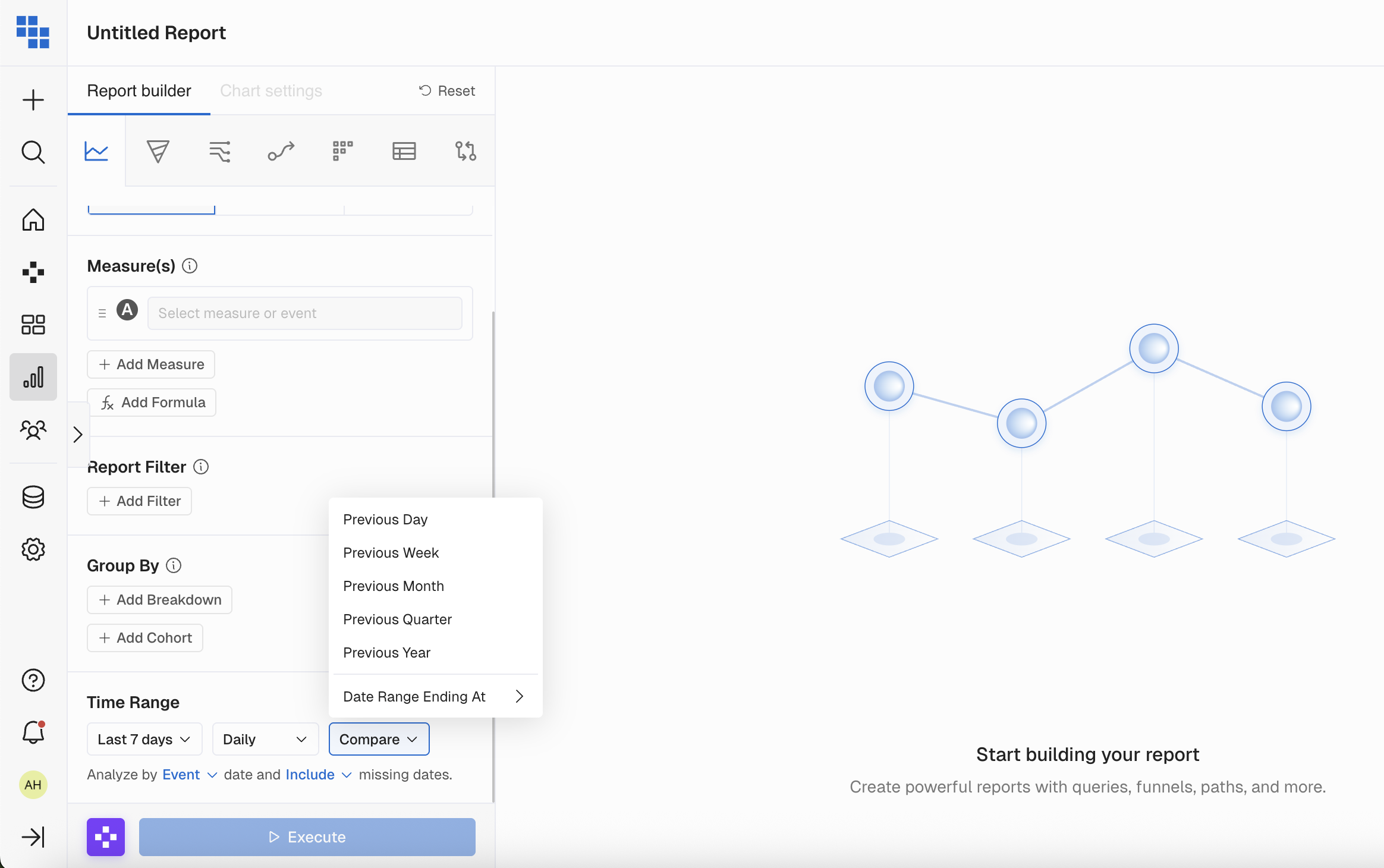 Week/Month/Quarter/Year- shortcuts to select a previous period based on the current report's date range. Custom- which allows you to manipulate the end date for the previous period and the start date is adjusted based on the length of the current report's date range