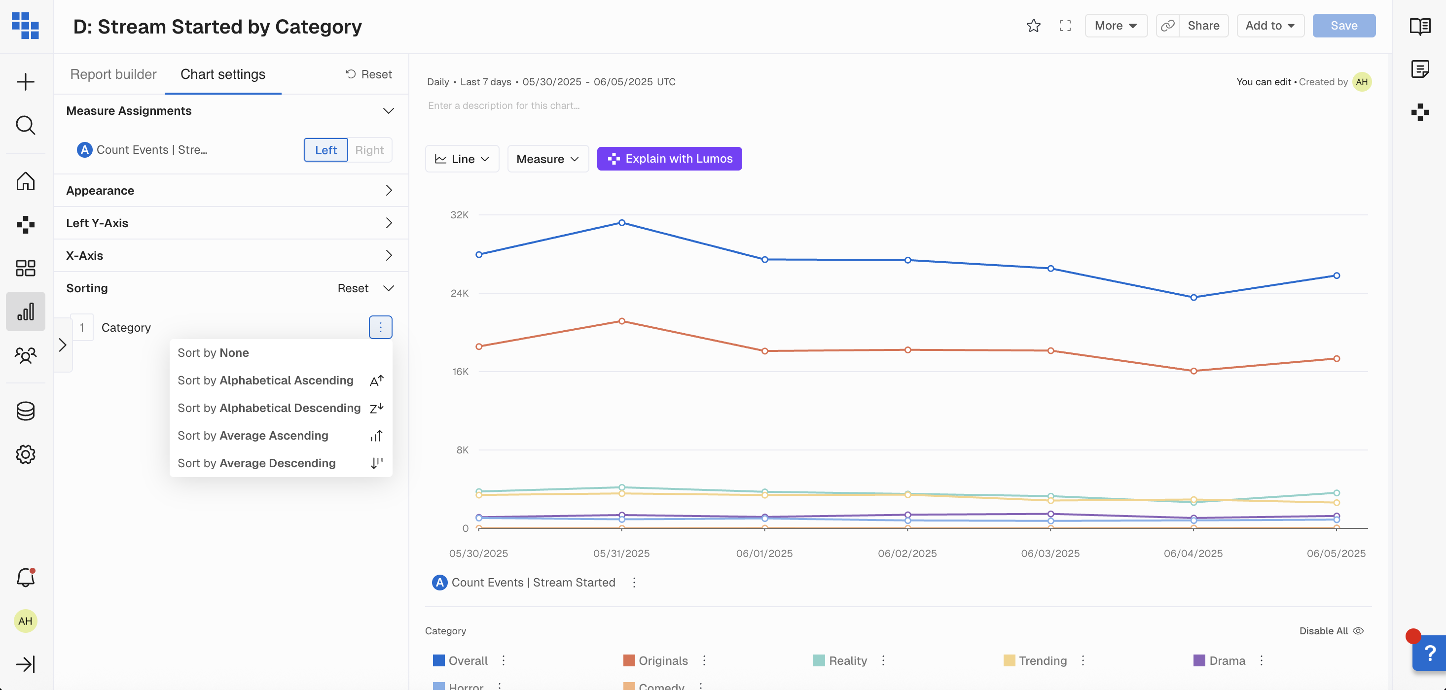 - Select the sorting logic you want to use for your report. You're able to sort by Measures as well as discreet breakdown groups.