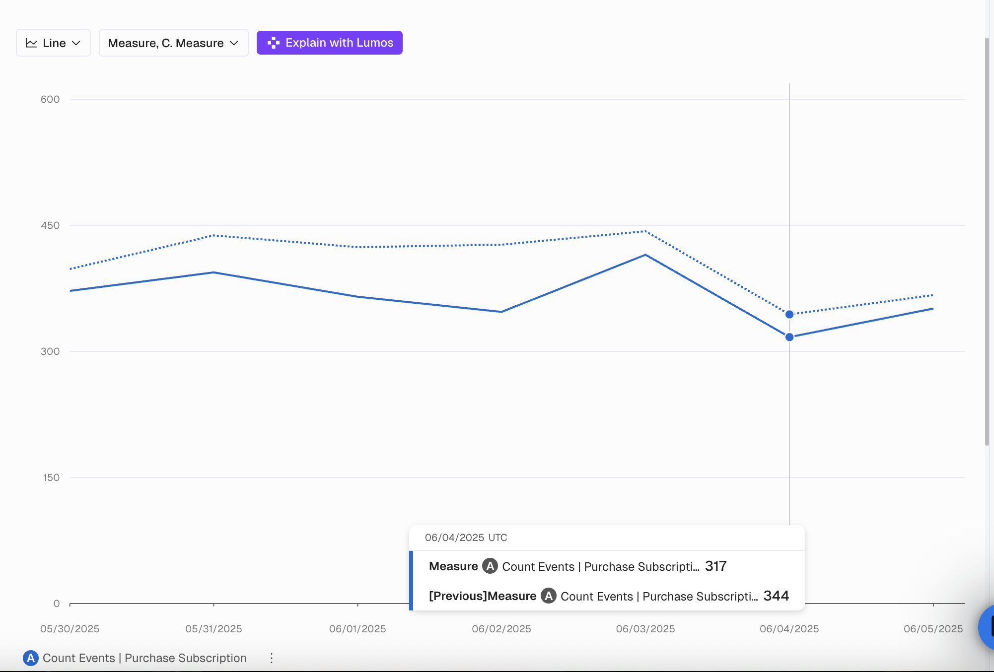 When using Compare any metrics for the previous period will be displayed as a dotted line on the chart, while the metrics for the current period will be displayed as a regular line, as shown here: