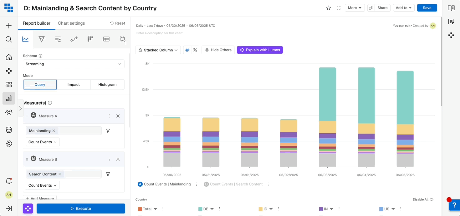 Sometimes you will do a Breakdown by a high-cardinality Field in your Query. In this case you will get a group called Others on Stacked charts and it may be a substantial percentage of the overall results. But what if you wanted to see the percentages on your Stacked chart calculated based on what's shown on the chart? Then you should click the Hide Othersbutton: