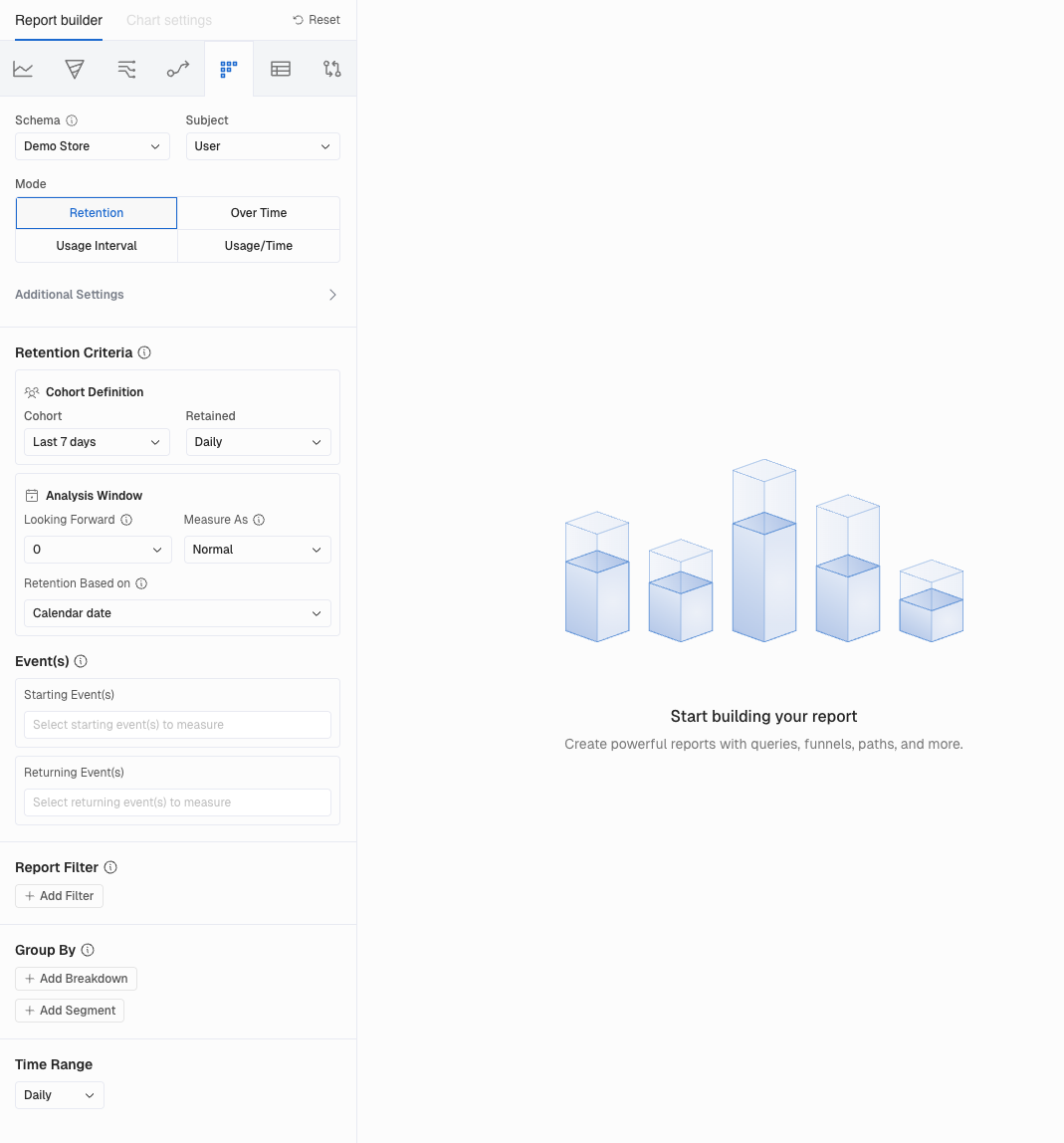 There are multiple ways to measure retention, so in this section, we'll cover the ones supported by Kubit. However, there are some common concepts between all retention types.
