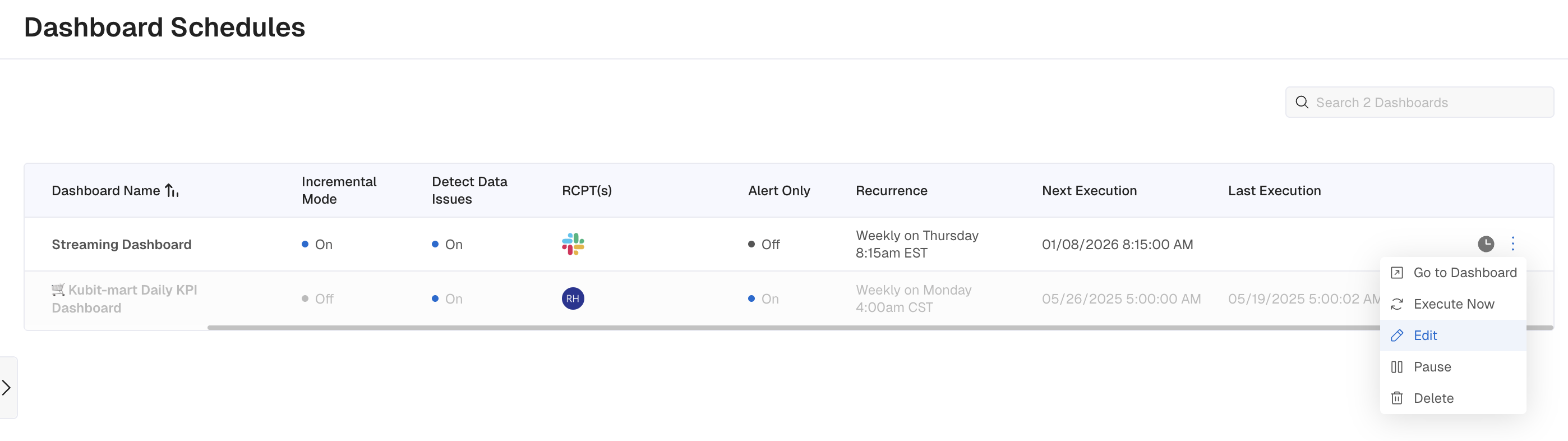 Alert Only toggleWhen Alert Only is toggled on, the Dashboard will be refreshed as configured but an email or Slack notification will be sent only when at least one chart on the Dashboard contains an anomaly .