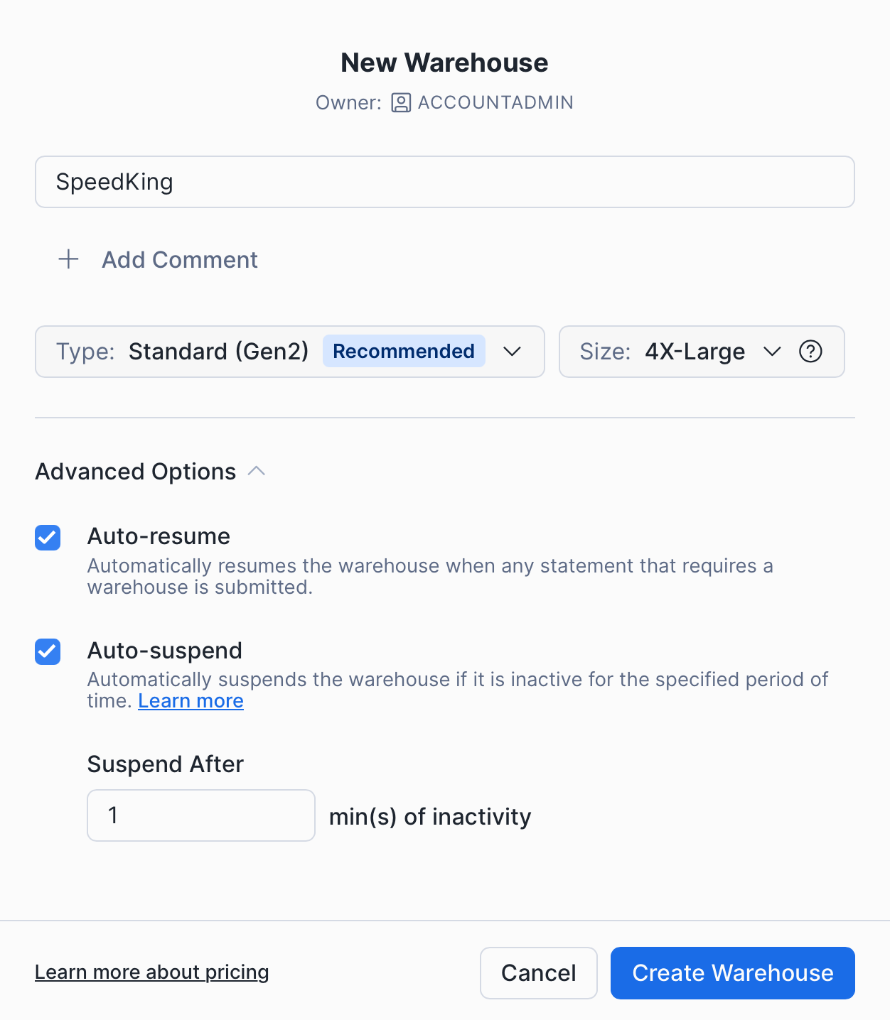 CREATE OR REPLACE WAREHOUSE KUBIT WAREHOUSE_SIZE=... INITIALLY_SUSPENDED=TRUE;